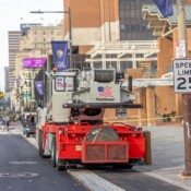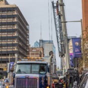 The disassembled sections were delivered to the site using one of our Western Star tractors hauling a flatbed trailer, navigating Center City streets with care to safely transport the oversized components.
