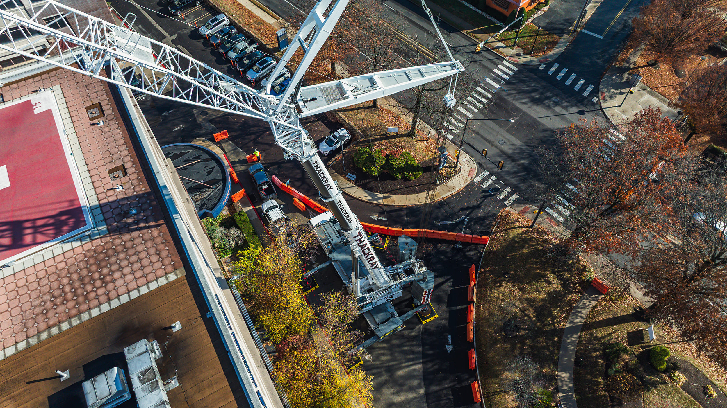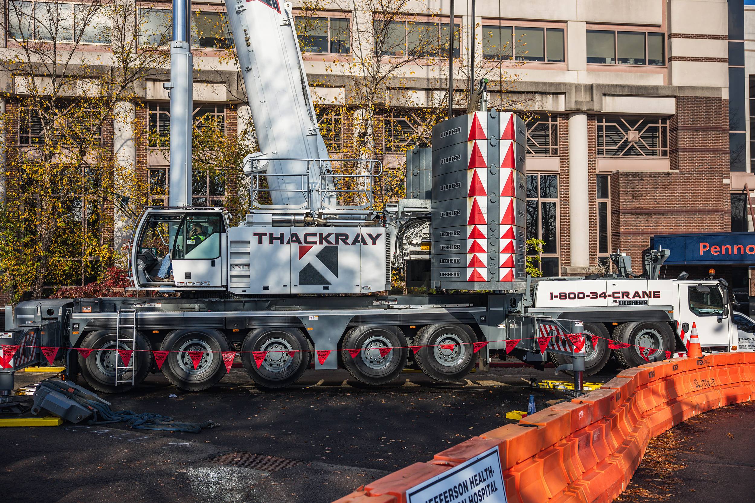 Operating within an active hospital campus requires precision and absolute attention to safety. To reach the Toll Pavilion rooftop while maintaining proper clearances and stability, Thackray deployed our 500-ton Liebherr LTM 1400-7.1.