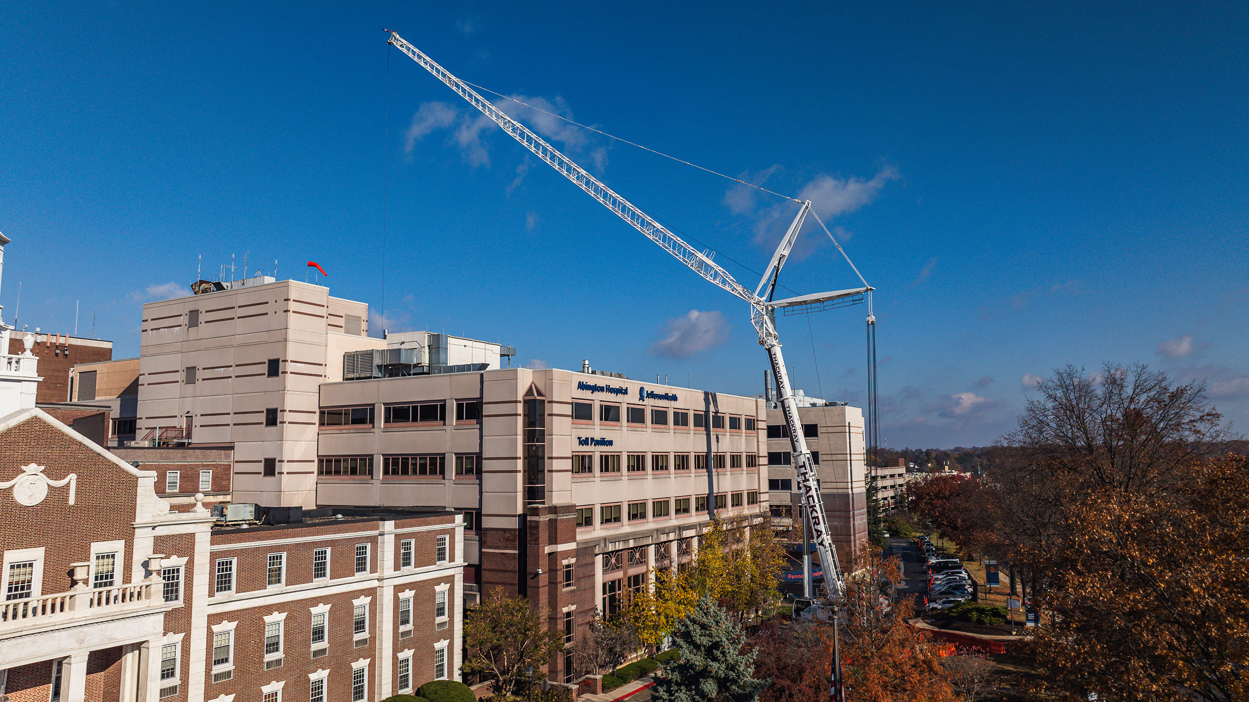 We recently supported Abington Hospital – Jefferson Health with a major cooling tower replacement at the Toll Pavilion. The project involved removing an aging unit and setting a new cooling tower system on the hospital rooftop. While the lift itself was substantial, the real story is how Thackray delivered a complete, end-to-end solution that kept the project on schedule and minimized disruption to daily hospital operations.