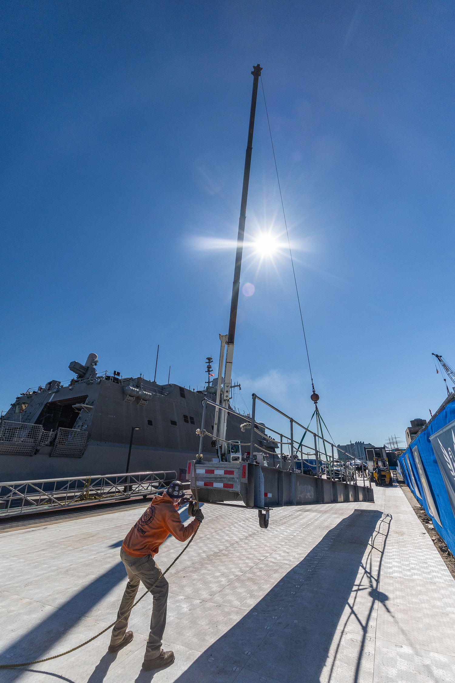 The video footage from the event highlights the precision of our operation. Our team utilized one of our fleets hydraulic truck cranes to precisely lower and place the heavy, custom-built ramps, ensuring a secure and stable connection for the thousands of sailors, veterans, and civilians touring the ships throughout the week.